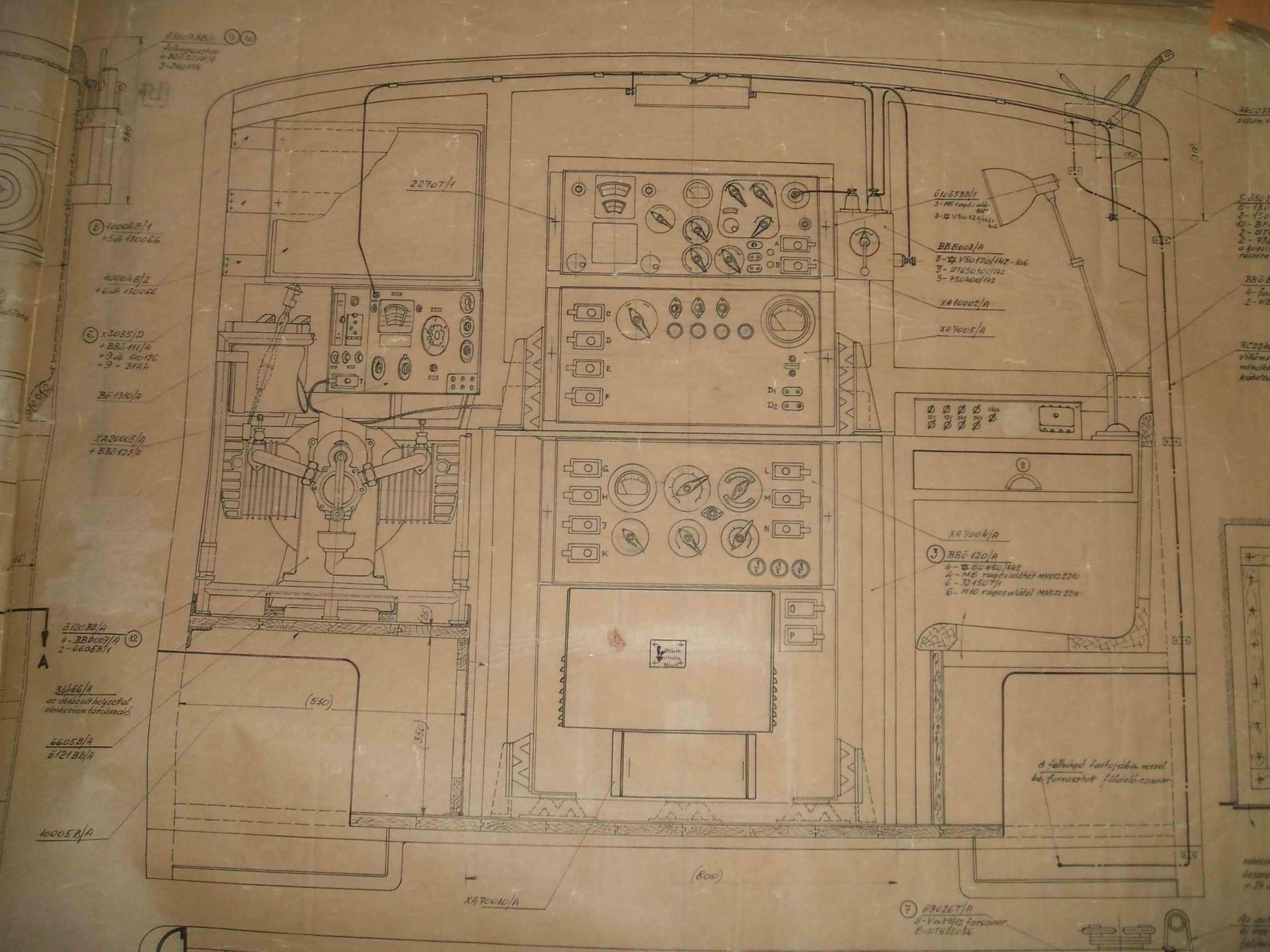 A műszaki tervezők elképzelései sem egyeztek a távírászok igényeivel, jól illusztrálja ezt a kocsi belsejét ábrázoló BHG gyári rajz, ahol a tápegységeket rajzolták középre, az adót fel a tető alá, a vevőkészüléket pedig távolabbra a munkaasztaltól. A súlyelosztásnak ez talán megfelelt, de a gyakorlatnak nem. Nyilván próbát tartottak, vagy kikérték gyakorló távírász-tisztek tanácsát, mert a megvalósult kocsikban jóval okosabb elrendezést találtunk:
