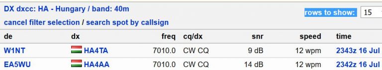 Nem szoktam a dolgot a véletlenre bízni, így adtam egy teszt hívást a reversebeacon.net számára. Egy amerikai automata W1NT vette a jeleimet, de hibásan. Mielőtt valaki azzal vádolna, hogy csúnyán adtam (nem szoktam :-), látható, hogy valószínűleg az első visszaverődésnél EA5WU-nál még jó volt a hívójelem. Szerintem csak elveszett egy pont a második visszaverődés közben.