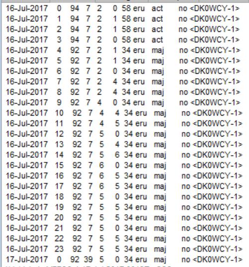 Megnéztem Kiel-ben is a mért értékeket (ld. a QRZ-s ábra alatt). Július 16-a utolsó órájában a K 5 volt, és a várható érték is 5 volt. Az SFI meg 92, ami az RH-sok jelének ionoszféra tükrét fényesíti, ha magas. E második ábrát persze már a QSO után készítettem, így nem tudhattam, hogy „téves” volt a várható K = 5 érték, bár látszik, hogy nagy volt az ingadozás.
