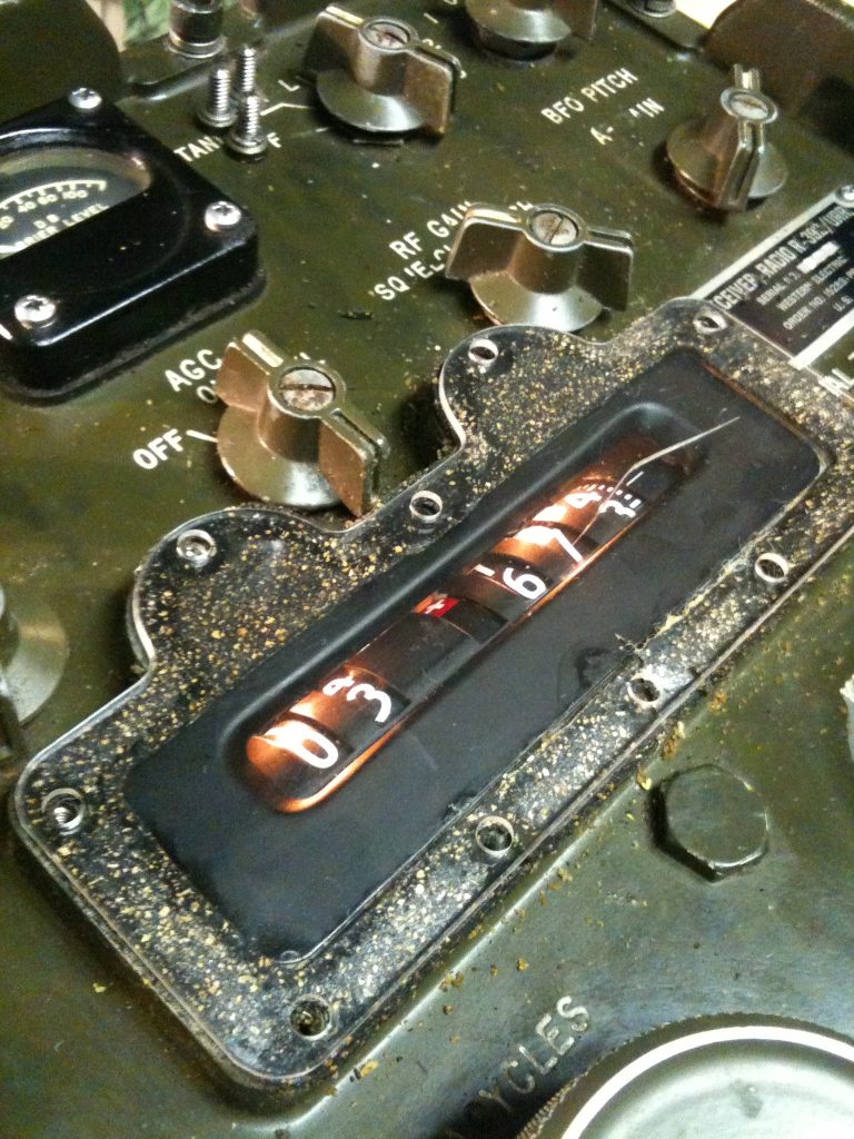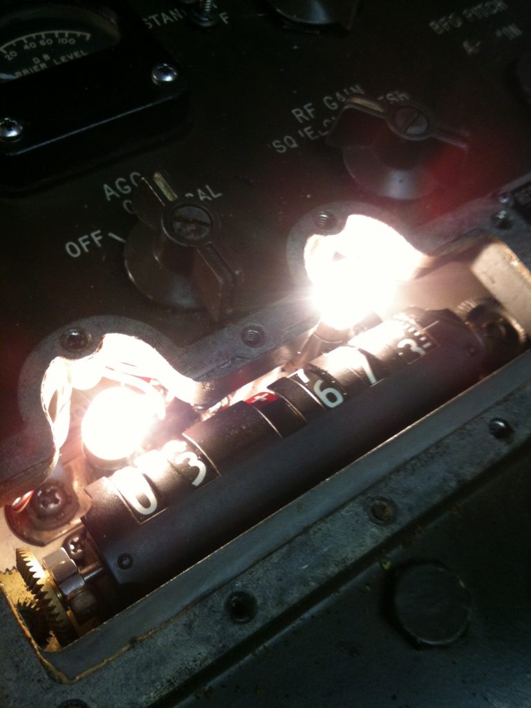Nekünk a skálavilágítás kapcsán voltak hasonló érzéseink. Az már az első bekapcsolásnál egyértelmű volt, hogy hang van, fény nincs. Na de egy skálaizzó nem foghat ki rajtunk! Mikivel egy kicsit nekiálltunk spekulálni, hogy mégis, hogyan is lenne a legegyszerűbb kicserélni azt a fránya skálaizzót? Először a józan eszünket próbáltuk használni, hiszen, ha mi terveztük volna, akkor elölről lehetne szerelni… El is kezdtük szétszedni, a fém burkolat gyorsan le is ugrott, de utána megtorpantunk. A skálát fedő plexi már így is repedt volt egy helyen, így csak félve mertük felfeszegetni, hiszen ez katonai cucc, minden része tömítve van. Fel is merült bennünk a gondolat, hogy mi van, ha hátulról lehet szerelni a lámpát? A kézikönyv persze erről egy szót sem írt, legalábbis mi nem találtuk. A vékony plexi alatt is gumitömítés feküdt, ami a hosszú évek alatt olyan kemény lett, mint a beton. Nem kis erőfeszítések árán, de sikerült eltávolítani a plexit a tömítéssel és az árnyékoló lemezzel együtt, de járulékos sérülés nélkül. Ezek után feltárult előttünk a két izzólámpa, amik a skála felett csücsültek. Sajnos kicserélni még így sem volt egyszerű, elég mélyen ültek a fészkükben, nehéz volt megfogni őket csupasz kézzel, de ennyi nehézség után már nem adtuk meg magunkat két nyavalyás skálaizzónak. De ezen is túllendültünk, és a csere után gyönyörű szép borostyánsárga fényben tündökölt rádiónk skálája.