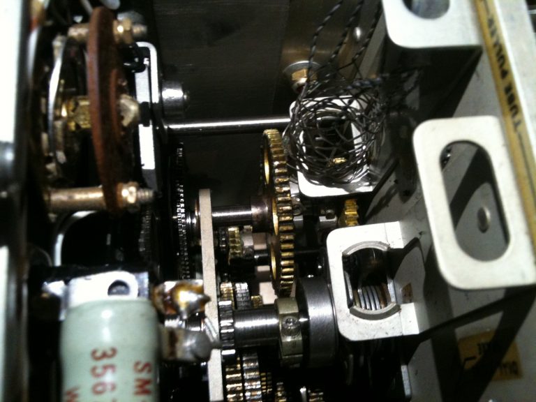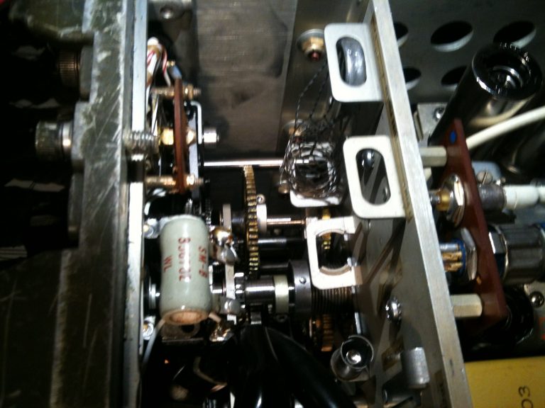 Nos, mint már Miki említette, rádiónk belseje inkább emlékeztet egy hajómotor szeleprendszerére, mint az általunk eddig ismert elrendezésekre. A bonyolult fogaskerékrendszer egy hibás fogaskerékkel, kis időre fejtörést okozott nekünk. Az előlapon látható két nagy forgatógombbal lehet beállítani a venni kívánt frekvenciát. A bal oldali gombbal lehet a Megaciklust állítani fokozatokban, míg a jobb oldali szolgál a Kilociklus beállítására fokozatmentesen. Nekünk a Kilociklus állításával gyűlt meg a bajunk, a gomb megakadt kb. 300 és 600Kc állásnál.