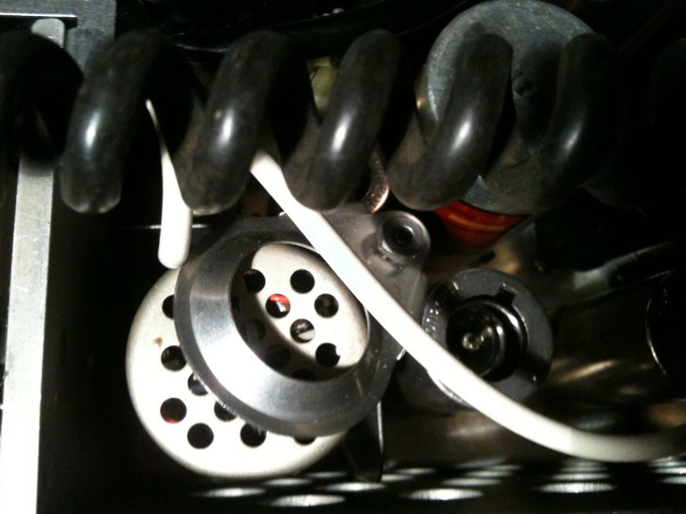 Maradt a tekergetés és nézgelődés. Többszöri ide-oda tekerés után feltűnt, hogy van egy fogaskerék ami nem mozog. Viszont a mellette lévő fogaskerék rögzítő bilincsének imbusz csavarja két véghelyzetben is belever a fogaskerekünkbe! Megvan! Itt van a probléma forrása! Tovább vizsgálva a dolgot, feltűnt, hogy már nem újkeletű a hiba, mivel az álló fogaskerekünk fogai itt-ott megsérültek már. Egyértelmű volt, hogy a fogaskerék rossz helyen van. Biztos ami biztos, ha már van egy ugyanilyen rádiónk, azért összehasonlítottuk a másikkal, hogy mégis, hogyan is kellene kinéznie. Sejtésünk beigazolódott, a fogaskerék lecsúszott a tengelyről, mivel fellazult a tartóbilincse. Nosza, tegyük vissza! Ez sem volt két kezes mutatvány. Miki az egyik csavarhúzóval a fogaskereket tolta fel a helyére, míg egy másikkal az ugyanezen a tengelyen lévő másik fogaskereket feszítette lefelé, hogy tengelyestül ki ne ugorjon a helyéről. Ezalatt jómagam a rádió készletében található imbusz kulccsal próbáltam meghúzni a fogaskerék bilincsét, de az sajnos rövidnek bizonyult. Szerencsére a kincstári készletben találtunk megfelelő hosszúságú szerszámot, így rövid úton a fogaskereket végre az eredeti helyén rögzítettük. A próba sikerült, a rádió immáron akadásmentesen működik! 🙂