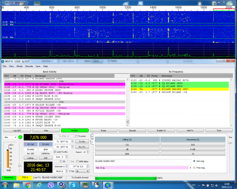 Egyébként eredetileg a JT65 URH EME összeköttetésre lett kitalálva és a JT9 lett volna az RH üzemmód. Nos a gyakorlat egy kissé felülírta az elképzeléseket, mert a JT65 nagyon gyorsan népszerű lett, és RH-n is tökéletesen bevált. Gyakorlatilag a JT9-es sávon alig találni állomást, míg a JT65-ön alig lehet elférni. Hogy ez miért van, az nem teljesen egyértelmű számunkra, mivel a JT9 kisebb sávszélességen megy, ráadásul néhány dB-vel még jobb is az érzékenysége.