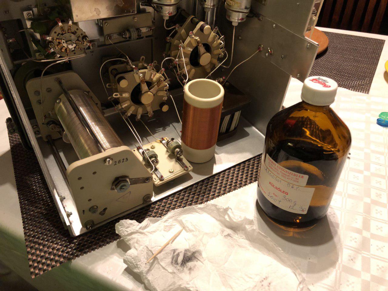 Kellet a takarítás hiszen a technika nem éppen mai, konkrétan 1988-as születésű, ha jól értem a jeleket. A finomhangoló tengelyén az idő kikeményítette a kenőanyagot, ezt kellet eltávolítani, ehhez a rémesen vicces “Külsőleg” feliratú patikaüvegben tárolt kilencvennyolc százalékos alkoholt vetettem be.