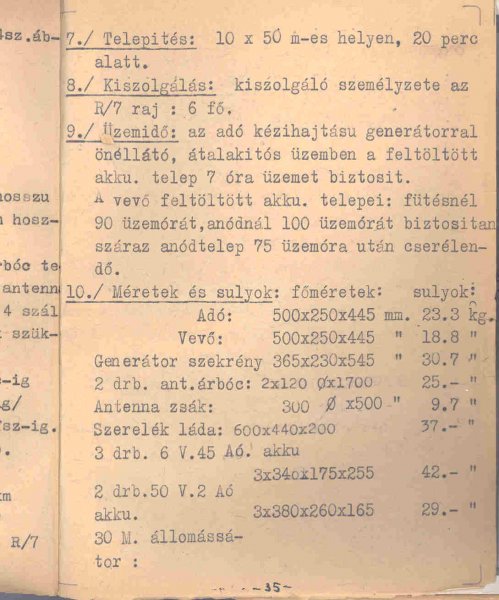 A 23,3 kilogrammos adó 500 x 250 x 445, a 18,8 kilogrammos vevő 500 x 250 x 445, a 30,7 kilogrammos generátorszekrény 365 x 230 x 545, a két, huszonöt kilogrammos antennaárboc 120 x 1.700, a 9,7 kilogrammos antennazsák 300 x 500, a harminchét kilogrammos szerelékláda 600 x 400 x 200 milliméter helyet foglalt. Az akkukészletek együttes tömege hetvenegy kilogrammot tett ki.