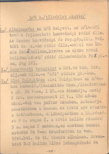 Jelen számunkban az R/8-at tárgyaljuk. (Joggal kérdezhetik: hol az R/4?! Meglesz az, csak apró turpisság van a dologban.) Ide kívánkozik egy korábbi megjegyzésünk, amelyet érdemes újra felidézni, hiszen e nélkül nehéz megérteni a honvédség akkori vezetőinek rádiójelzési logikáját. A berendezések számozását minden esetben a feladat, és nem a születés sorrendje szabta meg. Elméletben előre meghatározták, hogy milyen célra miféle készüléket kívánnak rendszeresíteni – ezek után pedig a katonai büdzsé és szükségletek függvényében nekiláttak az egyes darabok fejlesztésének, megrendelésének. A legkisebb egységeknek az R/1-et, majd az egyre nagyobbakon át a vezérkarnak az R/18-at szánták. Így fordulhatott elő, hogy az R/11-es repülőrádiót már 1935-ben szolgálatba állították – miközben R/10-nek még híre-hamva sem volt.