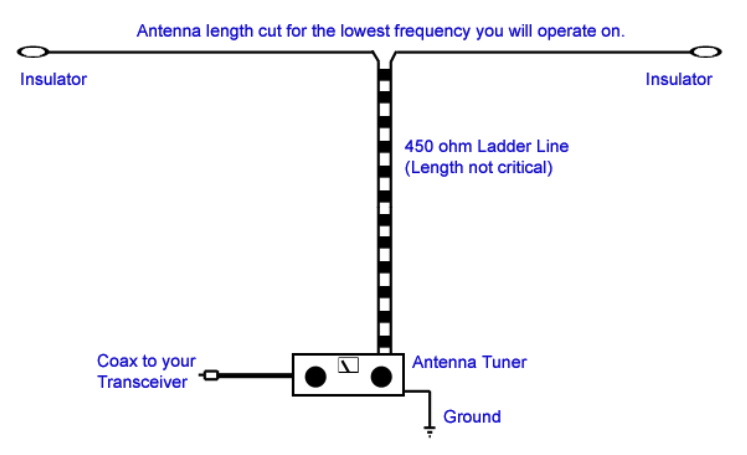Portable, multi-band antenna design is adopted from AI4JI’s presentation, which may be found at the followin link. The diagram depicts a Center Feed Dipole, which maybe tuned across all ham-bands from 160 to 10m bands by an antenna tuner. I chose this design, because of my preference for low loss exhibited by ladder feed line and the installation convenience due to its simplicity by not having to trim its size once installed.