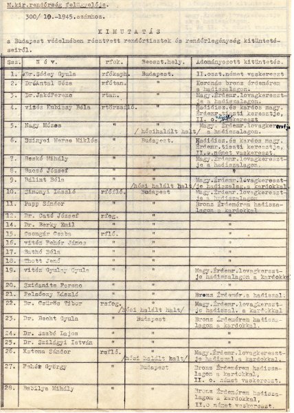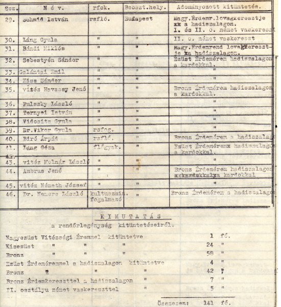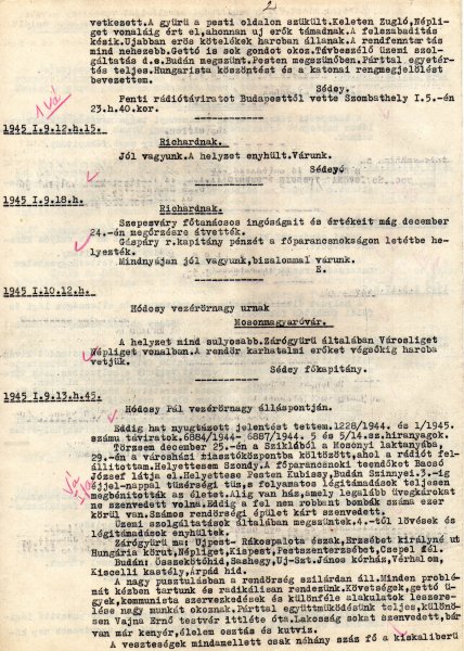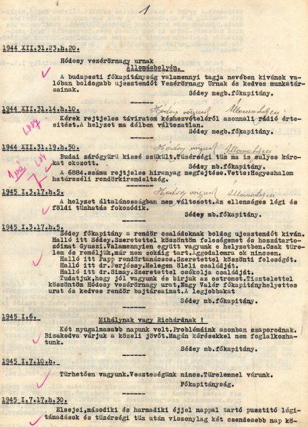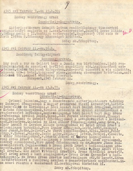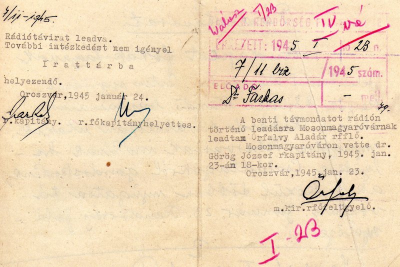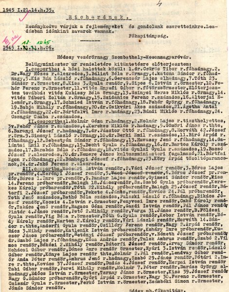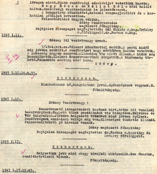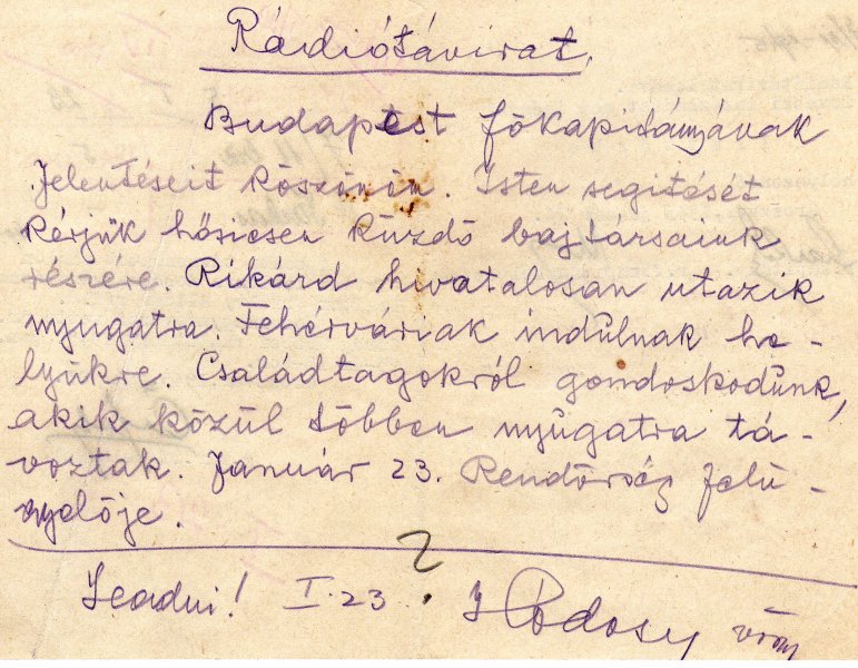 1945. I. 9. 13:45 A hungarista köszöntést, katonai rangmegjelölést és karhatalmi pótdíjat bevezettem. Felszabadítást nagyon várjuk. (Rejtjeles híranyagot megfejtették: Gál Miklós r. kap. Örfalvy r. főfelügyelő, dr. Farkas r. kap.)