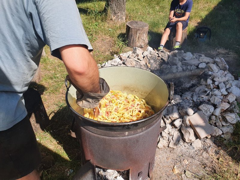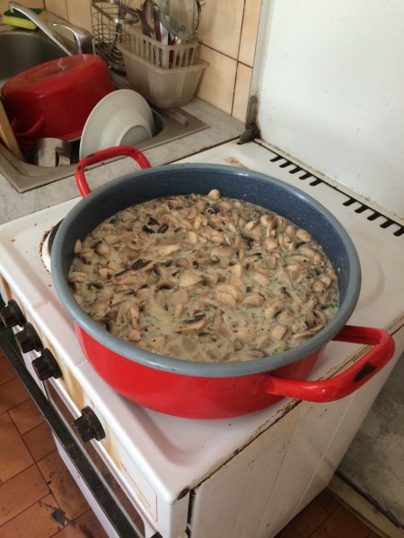 Miközben a konyhaasztalon nagyüzemben folyt a kívánatos édességek készítése, a tűzön már ott rotyogott az ötféle (róka-, csiperke-, vargánya-, őzláb- és laska-) gombákból főzött tejszínes leves. Az étekhez külön edényben tésztát is gyártottunk, így aki nem találta eléggé tömörnek a levet, még tehetett bele efféle kiegészítőt is…