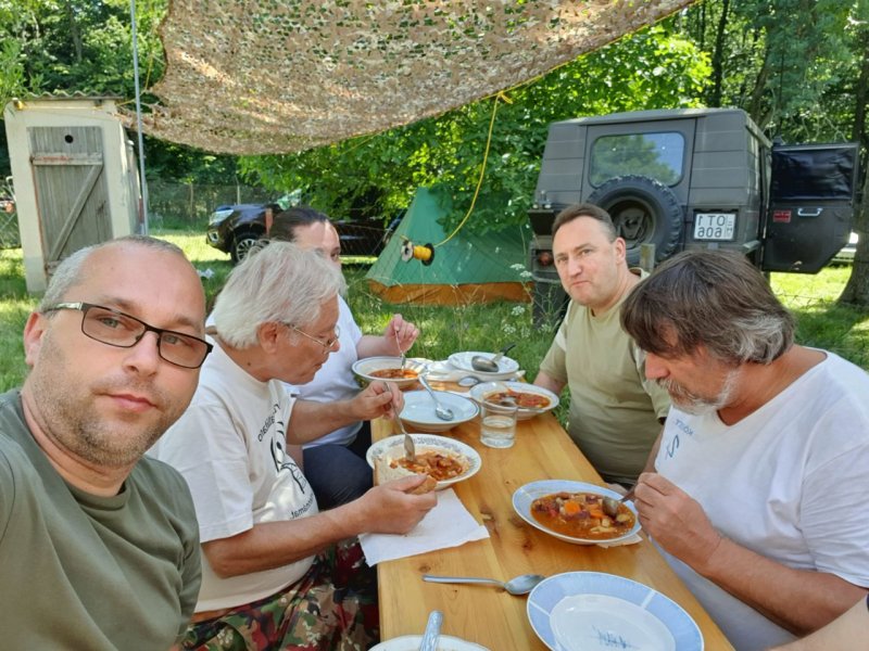 Néha enni is kell valamit! 🙂 🙂 🙂 (b-j) HA7PTY Pityesz, Pfaff Laci, Katica, HA5RV Stewart és István, HA7HJ Janó kedves barátja. Ezt az elképesztően gazdag ízvilágú babgulyást egyébként HA7HJ Janó főzte nagy szeretettel és odaadással pénteken. A fotón nem látszik, de volt egy kiküldött alezredesünk” is Székesfehérvárról. András barátunk remek sztorikat mesélt, s annyit fényképezett, hogy felforrt a kezében a gép. 🙂