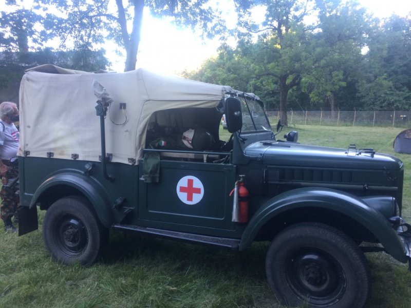 A gondos rendezőség természetesen az egészségügyi biztosításról is gondoskodni igyekezett. Ennek jegyében érkezett a telephelyre ez a remek Gaz-69-es géperejű jármű, amely – ha jobban megtekintjük a felvételt – stílszerűen egyből egy sebesültet is elhozott. Csak hogy legyen ilyenünk is. Persze szigorúan csak baba, semmi éles helyzet!