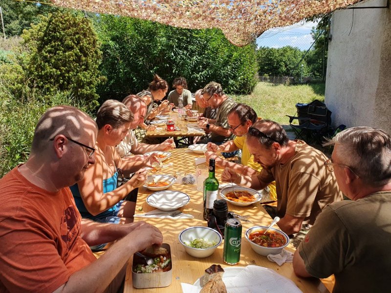 Na, de azonnali hatállyal térjünk vissza az asztalhoz! Mert enni kell. (b-j) HA8BIT Peti, Mari – Keró párja, Fanni, HA5AS Ákos, HG6PTZ Tomi, HA7EO Attesz, Paja és Karcsi. Szombaton pedig itt járt a szentendrei Altiszti Akadémi különítménye is, Imre Gábor alezredessel az élen!