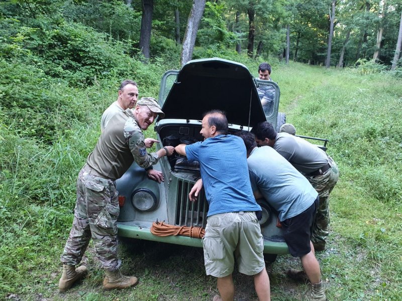 S ha már szóba hoztuk, ezt se hallgassuk el: a Gaz-69 hozta a nyári formáját, s idén is felforralta magában a benzint. Igaz, csak két alkalommal, s mivel már megvan a trükk, így hamar végeztünk a javítással. (b-j) Winkler Csabi, Stewart, Sanyi főhadnagy úr, az orrban kék pólóban pedig Paja barátunk szakérti a látvány’! 🙂