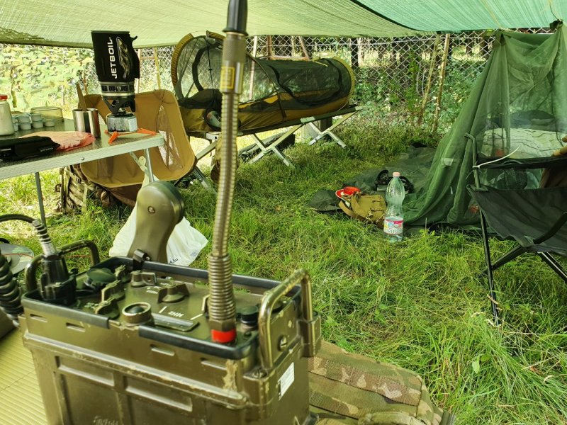 Lecsó utáni életkép HA8BIT Peti álcahálójának árnyékában. Ez amúgy egy remek tábori kiegészítő, még akkor is, ha a nyár helyett az őszt idézi. (b-j) HG6PTZ Tomi, Andris, Paja, (háttal) Bendegúz és Pfaff Laci, majd Sanyi és Fanni szemlélhető. Amúgy mindenkit nem tudunk felsorolni, így eleve elnézést kérünk azoktól, akiket kihagytunk.