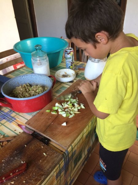 Mivel a reszelőt elvitte a markoláb, jobb híján késsel vágtuk apróra a HG5OJG Gergő által leszállított ízletes zöld almát. A cucc nem látott permetet, azaz full bio, de persze azért tisztességesen lefürdettük az egyes gyümölcsöket…