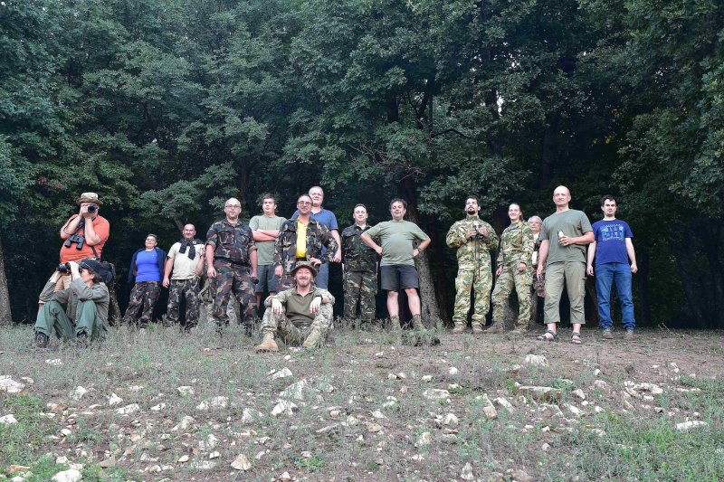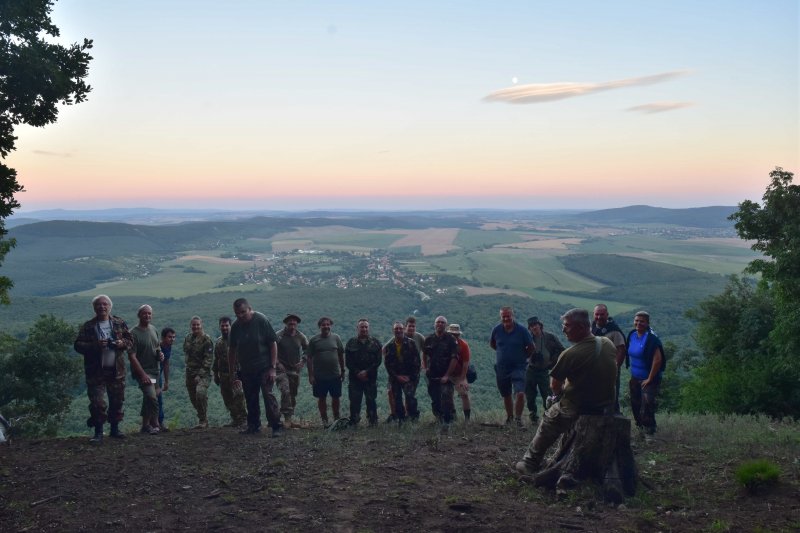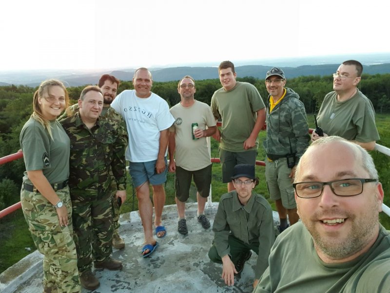 Ahogy ez sem! 😉 Hát akkor lássuk sorban, balról-jobbra, ahogy köll’! Fanni törzsőrmester úrhölgy, HA5RV Stewart, Sanyi főhadnagy úr, HG7ZSO Zsó’, HA7EO Attesz, Csepeles Dani, HG5OJG Gergő, HA6IGM Gyuri (aki előtt most is megemelhetjük a kalapunkat, hogy felmászott ide „azon” a létrán) – elöl guggol HA5AS Ákos és végül elnökünk, HA7PTY Pityesz. A geodéta torony felkeresése amúgy rendszeres esti programunk volt.