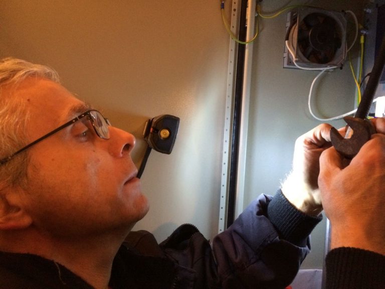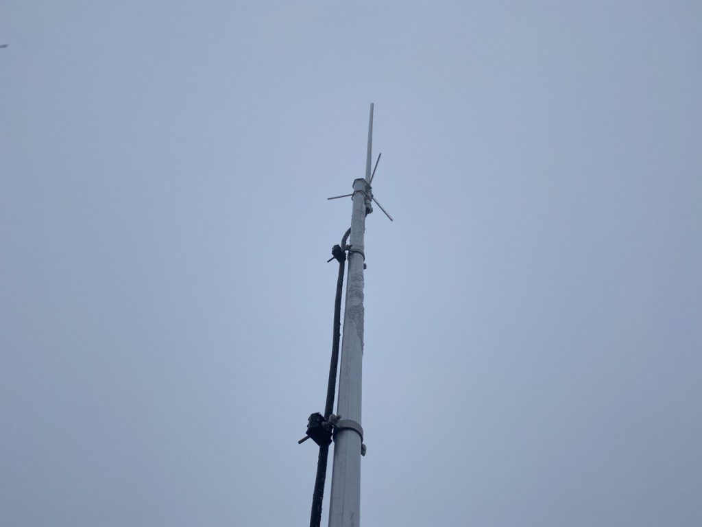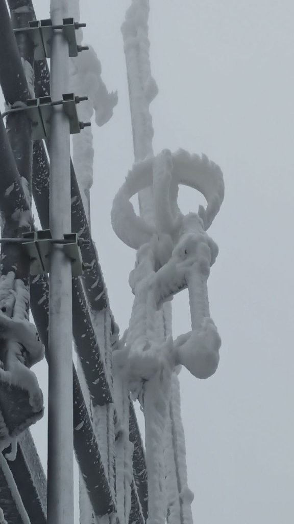 A szereléshez szükséges csapat viszonylag gyorsan összejött. Akadt, aki társaságban villanyt szerelt, más a cuccokat hordta föl és le, megint más a csövet tartotta a helyén, míg a többiek az anyákkal bajlódtak. Örömmel jelenthetjük ki, nem esett le semmi – ami azért nagy öröm, mert ebben a jégvilágban borítékolhatóan nem találtunk volna meg szinte egyetlen alkatrészt sem, ha aláhull a mélységbe. Mivel az átjátszó korábban egy ideiglenes QTH-ról már üzemelt, gyakorlatilag az új helyen „csak” föl kellett szerelni. Természetesen ha a klubot beengedik valahová, akkor értelemszerű a szép és szabályos munka.