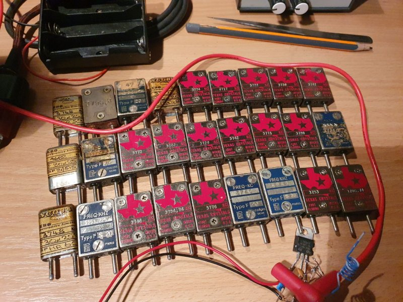 HA5SPA Péter a minap a szentendrei laktanyából hozzájutott egy nagy marték, rádióamatőr sávokon dolgozó kvarckristályhoz. Akad köztük olyan is, amely tán’ már a második világháborúban is harcolt. A lényeg, Péter épített egy apró kapcsolást, amely révén képessé vált ellenőrizni az alkatrészek működőképességét. Ami meg nem dolgozott, azt szétszedte.